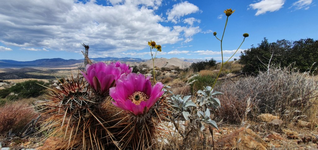 Cacti along the path remind me to be careful where I step, many of them are flowering with a variety of vivid colours