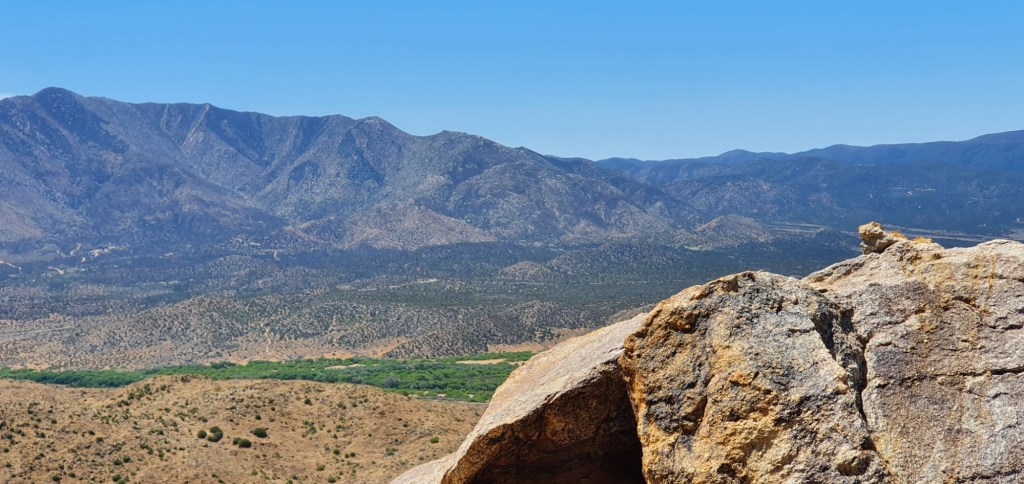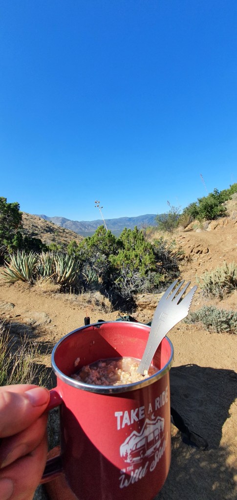 The trail meandered around the edge of mountains overlooking the San Felipe Valley. After a couple of hours, I saw the perfect spot to stop. There was space to unpack, get my cooker and pot out and start making breakfast. I’ve found that mixing apple & cinnamon, maple & brown sugar, and cinnamon spice oatmeal works really well. I stopped here and relaxed for maybe an hour while I ate my oatmeal, drank my coffee, and appreciated the view from my seat.