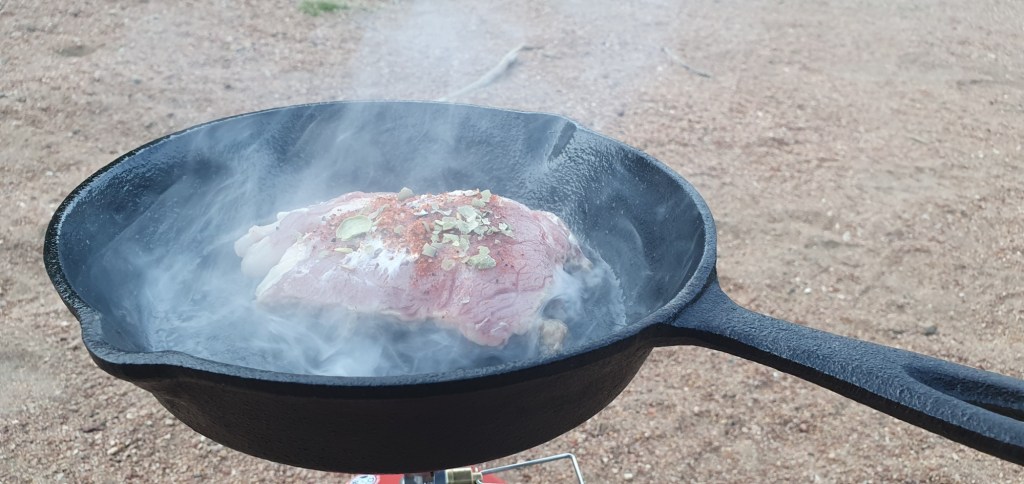 For dinner tonight I can finally cook the steak I’d been carrying since yesterday. Not only that, but I have a can of beer to go with the steak. Tonight’s epic dinner is also going to significantly lighten my pack for tomorrow, and make it easier to cram everything in too.