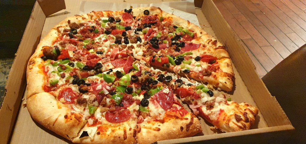 A few other hiker groups were in town, including a lot of familiar faces. With the resupply work done, we decided to go back to the pub to meet up. After a couple of beers, we picked up huge pizzas from the local spot across the road, I instantly realized my eyes were bigger than my stomach.