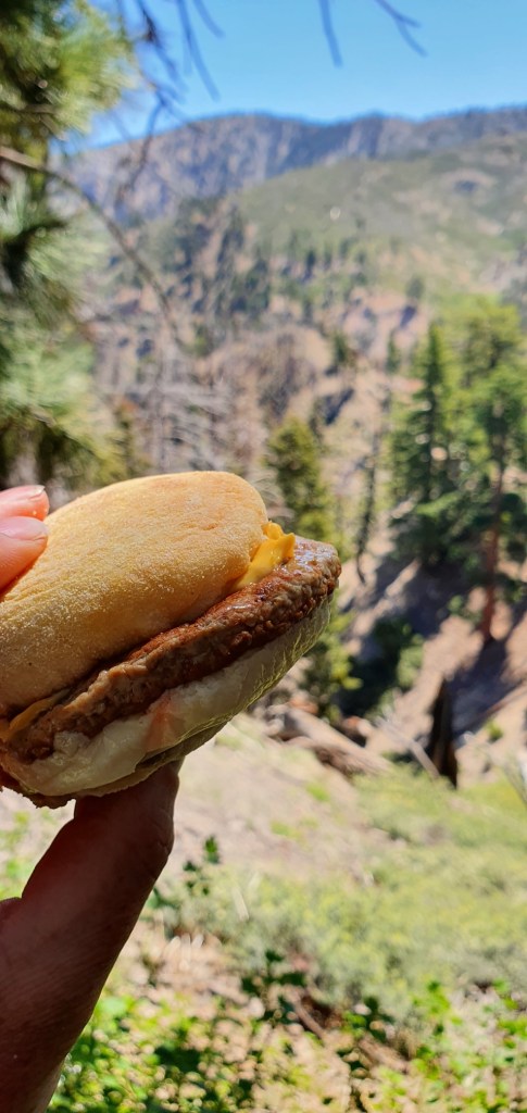 After bagging a couple of peaks, we followed the PCT until Little Jimmy Spring. Here, we can collect water from a metal pipe embedded in the rock. This is also a good spot for breakfast and I heated up a couple of McMuffins from Cajon Pass.