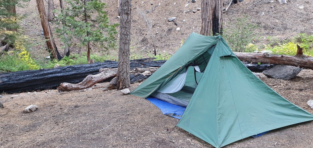 Eventually the road takes us to the Buckhorn Campground, where we can access the Burkhart Trail. It’s great to be back on trail again, and very shortly we arrive at the junction with the PCT. Having finally walked around the closure at Williamson Rock, we decide to stop for dinner while it’s still light. After dinner, there is just 1.2 miles to the camp at Cooper Canyon. There is a stream flowing through the camp and space for 20+ tents, as well as pit toilets and animal proof food storage lockers.