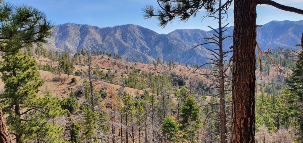 The day began with a long climb out of Cooper Canyon. The trail loops around a huge bowl, and I could look across and see the trail half an hour behind me. We climbed through tinder dry pine forest, which provided a bit of shade to keep me cool.