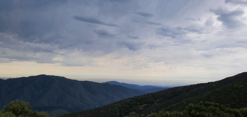 I made the long descent towards a river and road crossing. For several hours the trail gradually wanders downhill, with views into more mountains to the west. The air was muggy and a few drops fell, but no real rain came through, despite the overcast skies.