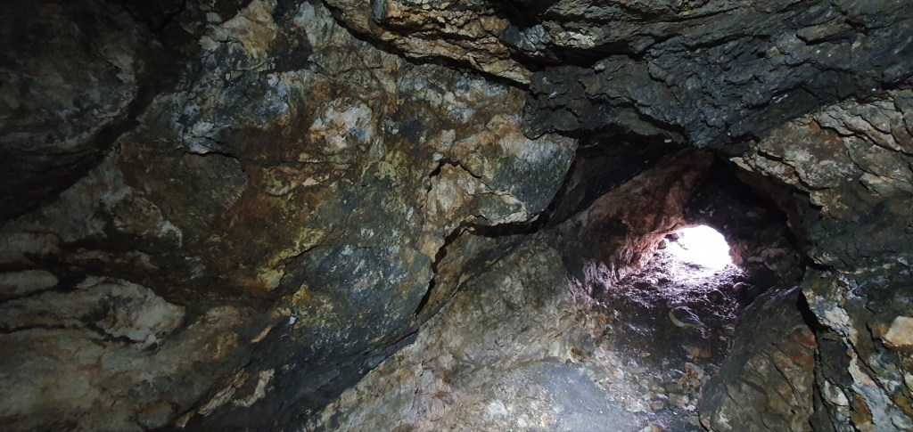 After the road crossing, the trail climbs again, on the way up I pass 3 small caves, or disused mine entrances rather. The first one is the biggest, with high ceilings and a forked tunnel extending about 20 meters from the opening. The second and third caves are much smaller, with signs of people having spent time or even camped inside.