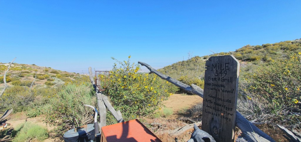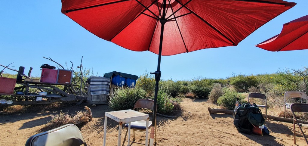 By the time I got up the second climb, I was absolutely exhausted. I was moving at a snails pace, probably from heat exhaustion. I came around a bend and saw two red umbrellas poking out through the scrub, it looked like a miracle. Someone has created an oasis out here, there are two big water barrels, filled almost daily with fresh spring water. Next to the water, lockers with snacks, fresh oranges, a logbook, board games, and a hiker box with miscellaneous hiker junk inside.
