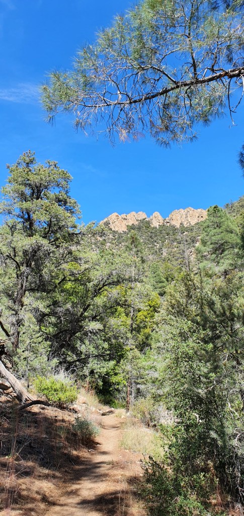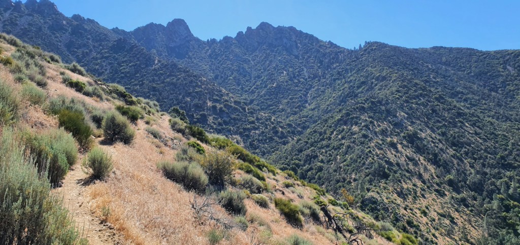 Further down the descent I look back up the trail at Sawtooth Peak, it’s an appropriate name but must be a pretty big log to cut. Down here there is good tree cover in places, although I can still feel the air warming up as I get lower.