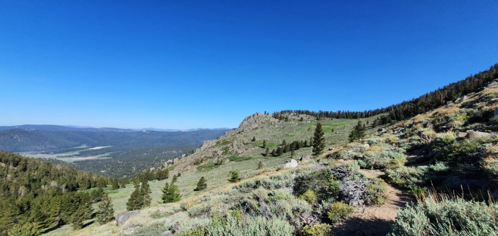 I got on trail at 8 am, and immediately faced amazing views over the same meadows which I was walking through yesterday. The trail crosses the mountainside, climbing slightly to reach a saddle up ahead.