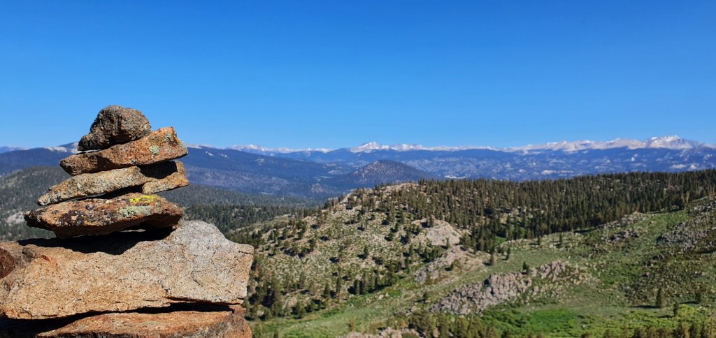 The view from the saddle is obscured by trees, but I step off trail about 30 m to get up on some rocks. From up here I can see far off mountains with snow patches on top. These mountains are exactly where I’m headed, and I’ll get the chance to see them up close in just a couple of days.