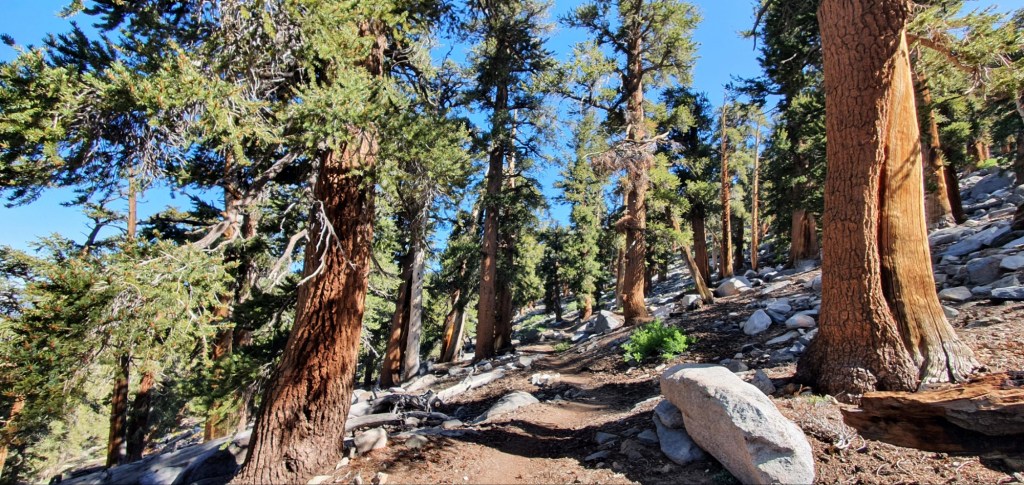 I begin to descend here, through the high forest of Sequoia trees, into more dense woods. The air gets warmer and thicker as I descend to about 9000 ft. I’ve only spent one night above 10 000 ft, but already, coming down to 9000 ft feels like getting boost.