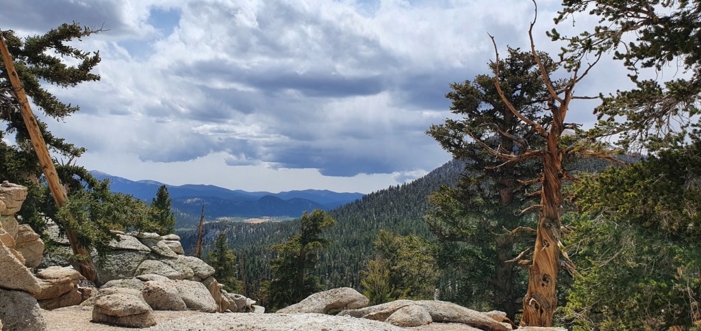 The air remained crisp and cool, and the trail began to climb again about halfway through the day. This is usually when fatigue starts to kick in, legs get a bit sore and feet start to ache, shoulders too. I still felt the exciting mountain energy though, and I was able to climb fast in the cool air without heat holding me back. I reached a great lookout and I could see towards where I’m headed. There were some fairly heavy looking clouds out there, which I hoped weren’t for me.