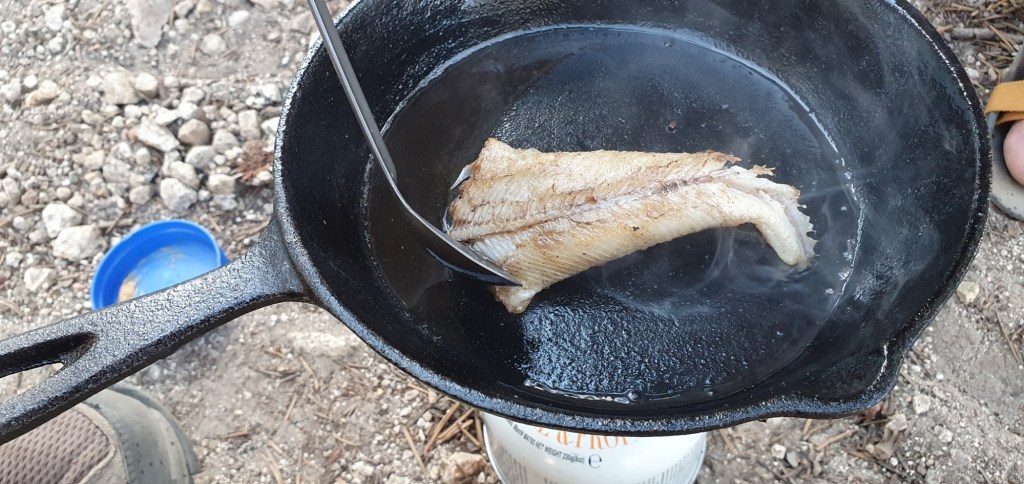 After some hunting for a good spot, Rox catches two trout in the creek. Of course I get the skillet ready and cook up the fish, they’re small but taste absolutely delicious. We hang out for the evening with another PCT hiker named Frizz, and a John Muir Trail hiker who is doing the JMT northbound. The four of us are hoping to reach Forester Pass tomorrow morning to descend the north side before the snow gets too hot in the sun.
