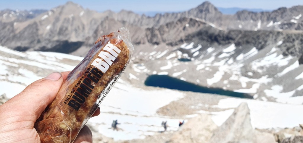 Moments later, I’m at the top of Forester Pass, the highest point on the PCT. I spend some time up here, enjoying the view, taking photos and eating snacks I brought all the way from home; Whittaker’s chocolate and a Bumper Bar. The views from here are unreal, and I feel incredibly privileged to enjoy them in perfect conditions.