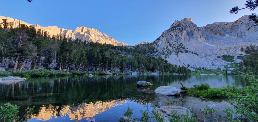 The campsites around the lake offer beautiful views of the mountains as the sun drops behind Kearsage Pass. I find a great spot, close to the water, with a running stream nearby too. This is the perfect place to stop before climbing over the pass, I can sleep at 10560 ft, 3219 m, before heading back into the Sierra once more.