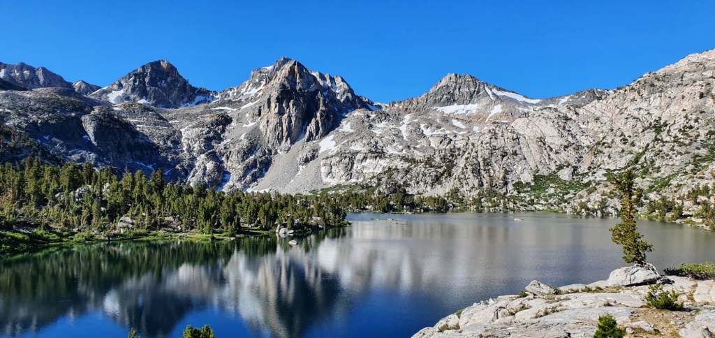 It was a cold start this morning, but that did seem to slow down the mosquitos a bit. When I got out of camp, it was a beautiful clear morning with no clouds in the sky. The trail wraps around Rae Lakes, then drops down to cut in between Arrowhead Lake and Dollar Lake. Between these lakes I make the first knee deep river crossing of the day, I’ve found that it really helps to take my socks off and remove the insoles from my shoes too. This way, I can still wear my shoes properly when I cross, but afterwards when I put my dry socks and insoles back there’s not much water left to saturate my feet.