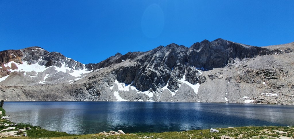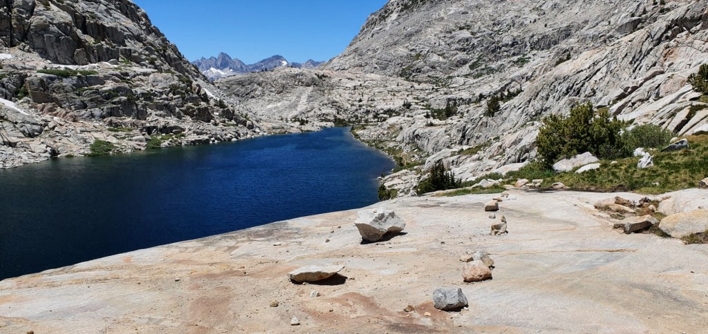 Off the face, the descent leveled off slightly and took me past the Palisade Lakes. We passed high above the lowest lake, walking on smooth rock marked by small stones. A quick descent to the water’s edge had us walking along the shoreline. All of this was just a quick break from the real descent though.