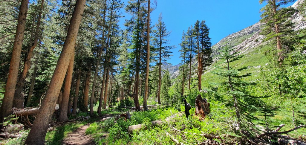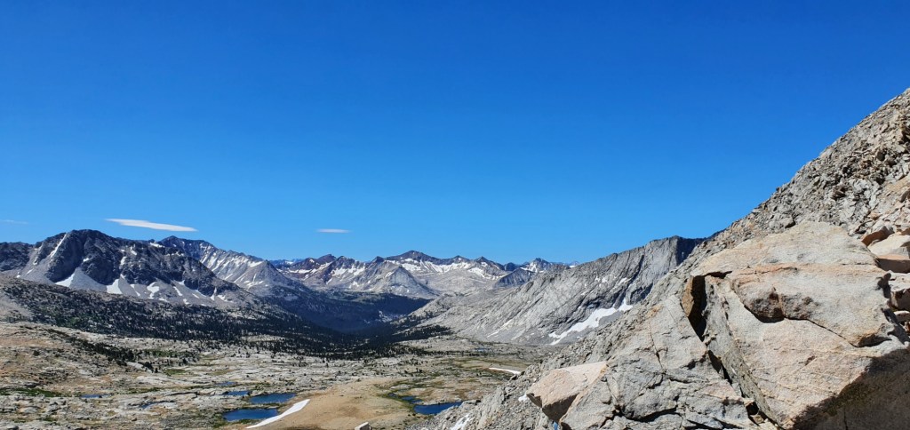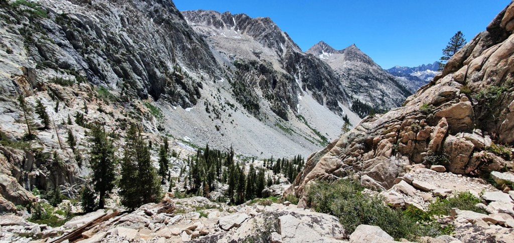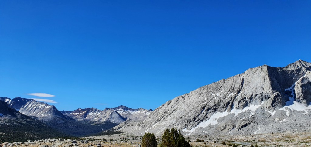 This morning I crossed Mather Pass at 12094 ft, 3686 m. Camping close to the base meant I had fresh legs for the climb, and with my acclimation back I was able to enjoy the steep push that comes at the end of these passes. In the afternoon I made the long descent into Palisade Creek, from the top of the pass, down to 8428 ft, 2569 m. After the pass and creek decent I had covered 12.5 miles, 20.1 km.