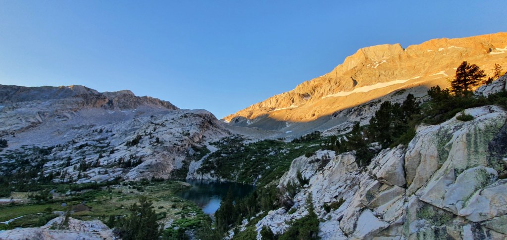 I walked around Evolution Lake before dropping over the end of the valley into McGee Canyon. After about an hour and a half of fairly steep descent, I arrived at camp. A nice sheltered spot near the river and a meadow with good views of Mt Mendel, Mt Darwin and The Hermit as the sunset painted them in golden orange light.