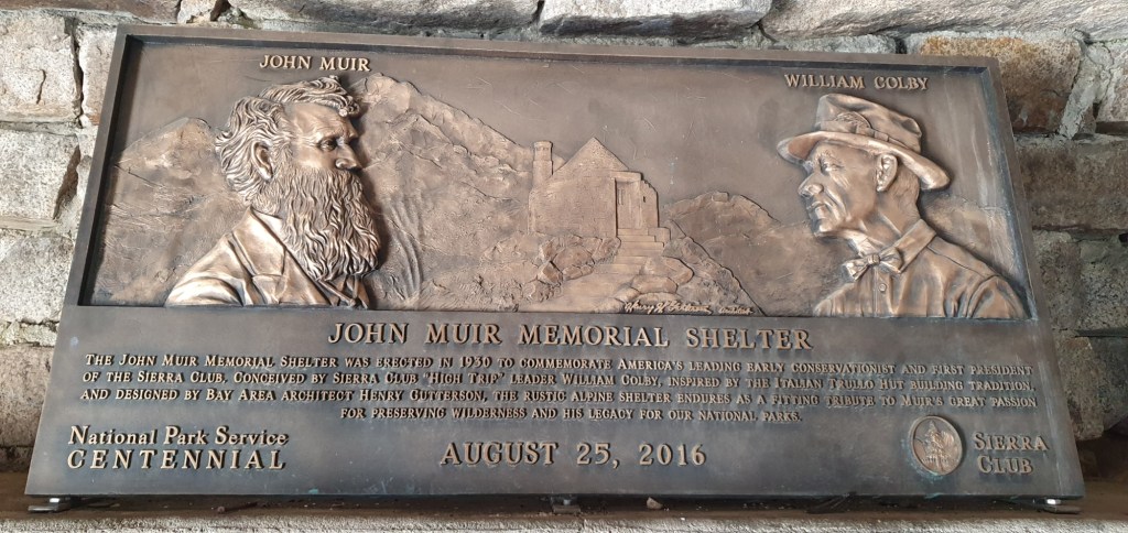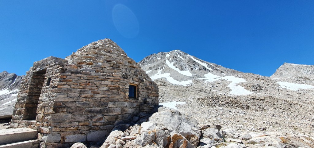 After only about 20 minutes on the switchbacks, we got to the pass. There was a stone shelter up top with a logbook to sign, the John Muir Shelter. I spent some time reading the logbook before adding my name too.