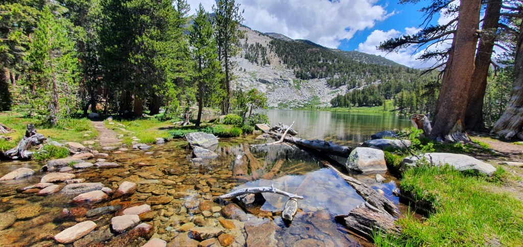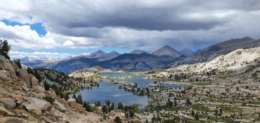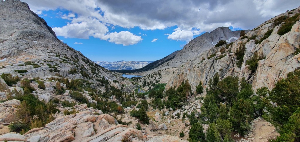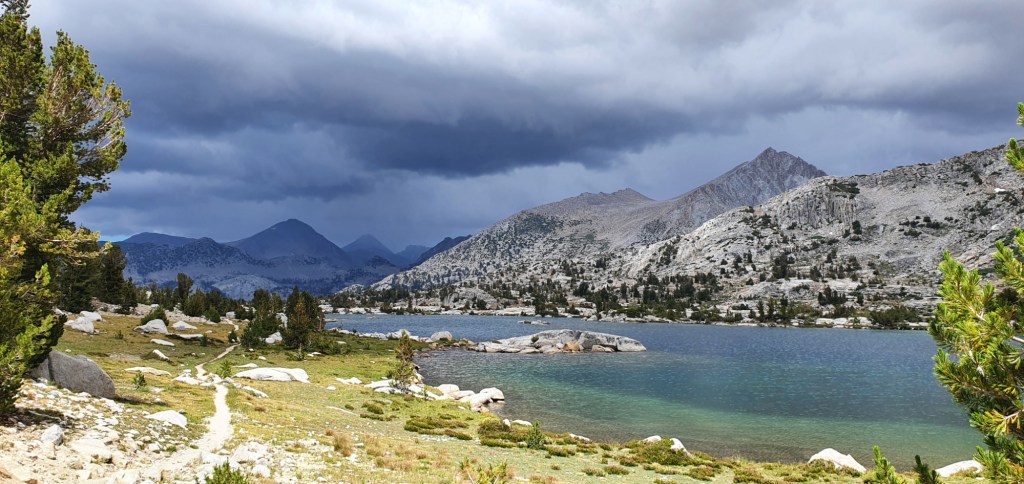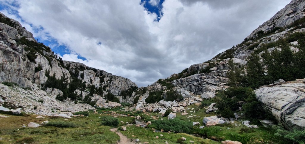 As I descended towards Marie Lake after the pass, the clouds became darker, but still stayed away. The wind on the pass was blowing towards the clouds, and I hoped that would keep them distant as I continued down to the valley.
