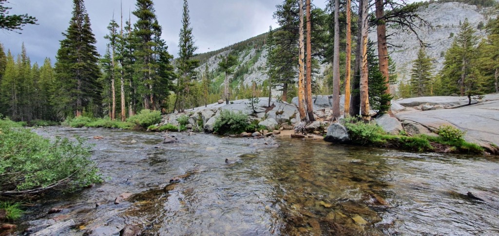 In the end, I had to put my jacket on anyway, when I crossed Bear Creek the mosquitos were horrendous. The rain stopped eventually, but I kept the jacket on to keep the bugs at bay. Shortly after crossing the creek, I found camp. John Muir Wilderness regulations are to find camp at least 100 ft or 30 m from the trail or water, so it took a while to find a useable spot. In the end I found a nice flat spot a long way from the trail and a little up the hill.