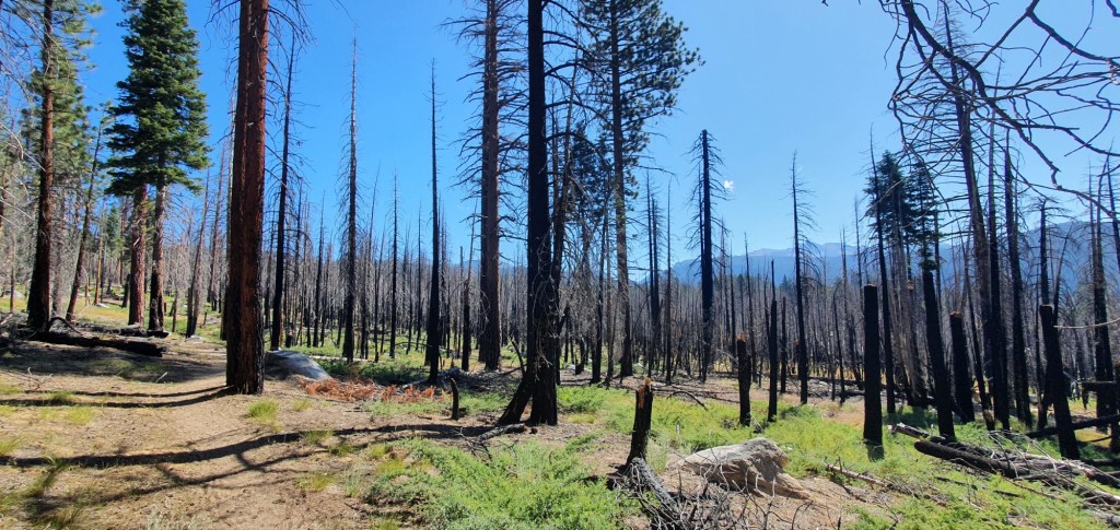 The trail from VVR started just around the corner, and headed into a 5 year old burn zone. All around were bare and blackened trees. A lot of these trees had fallen, but work had recently been completed to clear the trail.
