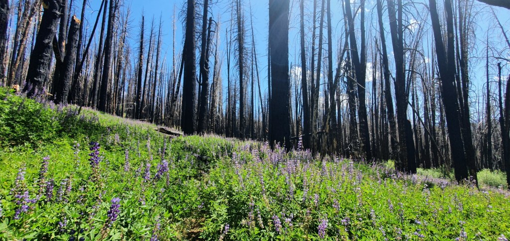 The burn zone lasted for about 5 miles, and took me several hours to cross. Further up the hillside, the trees seemed larger and older, there was more scrubby regrowth underneath too but no new trees emerging yet.
