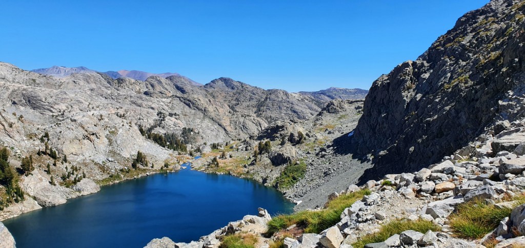 Shadow Creek intersects with the JMT and we followed it north for a couple of hours until it reached a saddle over Garnet Lake. We hadn’t planned on camping here, but it was slow going in the morning so we set up camp and appreciated the views from the pass.