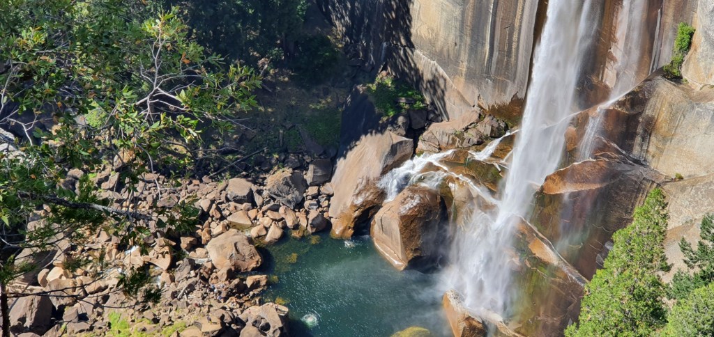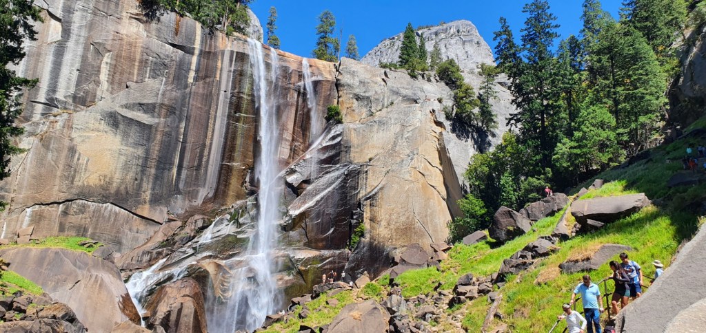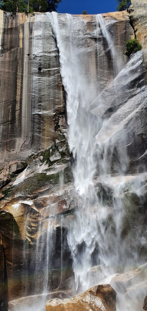 We bought supplies from the village store and headed off towards the Mist Trail early in the afternoon. The trail climbs out of the valley and gives us views over Yosemite, naturally it was packed shoulder to shoulder with people. We were fortunate to be there on a Thursday, meaning that the Mist Trail was open for us to walk to the base of Vernal Falls.