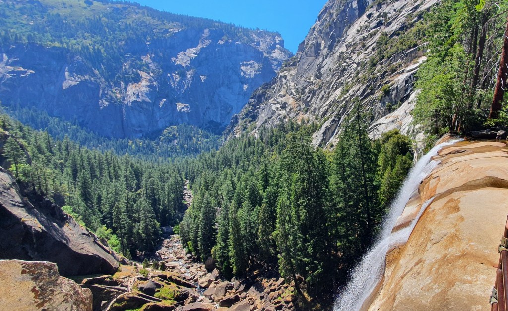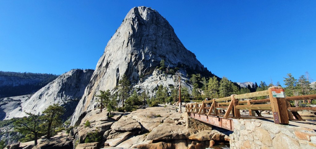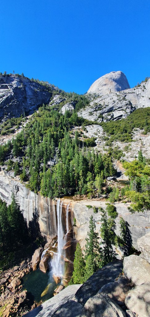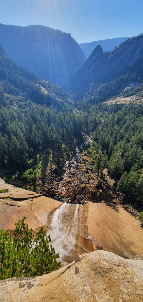 We had another steep climb from Vernal Falls up to Nevada Falls. We took a side trail up to Clark Point on the JMT which got us away from the crowded Mist Trail, and also gave us a view down to the Vernal Falls far below.