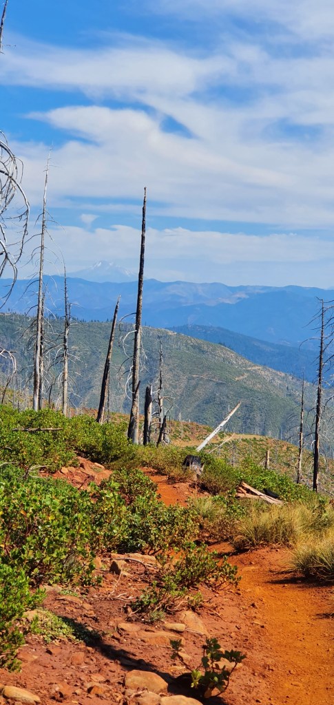 As I climbed up to the ridge, I passed through burned forest, and emerged onto an exposed section of trail with fantastic views up the valley towards Mt Shasta. The heatwave was in full effect, and once again I find my reflective umbrella was a lifesaver.