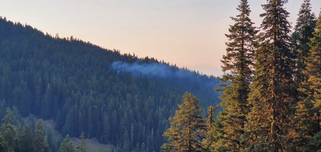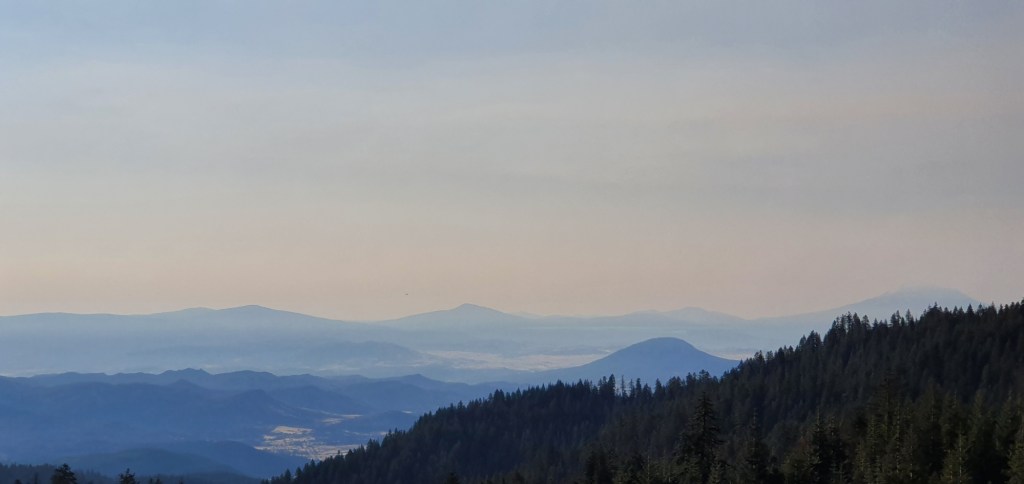 The storm had passed this morning and I woke to a fresh day with clear skies. I climbed gently from camp up to Meridian Overlook, on the way up I saw a wildfire starting up on the side of Siskiyou Peak. The trail follows a ridge around for several miles to Grouse Gap. I then spent the rest of the day descending steadily alongside Mt Ashland Ski Road. On the way down I met Keith the trail angel, giving away beers, soda, Gatorade and snacks at the main road crossing. The long descent finally took me to Callahan’s Mountain Lodge, covering 14.5 miles, 23.4 km.