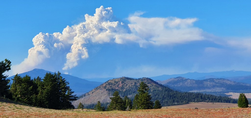 We all walked around the Crater Lake Rim trail, enjoying the views over the water as we made our way around the lake. When we reached the northern side, huge pyro-cumulus clouds were rising up ahead. The Emigrant Fire was growing and had spread to 5 miles from the PCT, a closure threatened the trail just 0.1 miles west of the trail. It felt strange to walk towards a wildfire, but we knew an alternate route further east which was unlikely to be strongly affected.