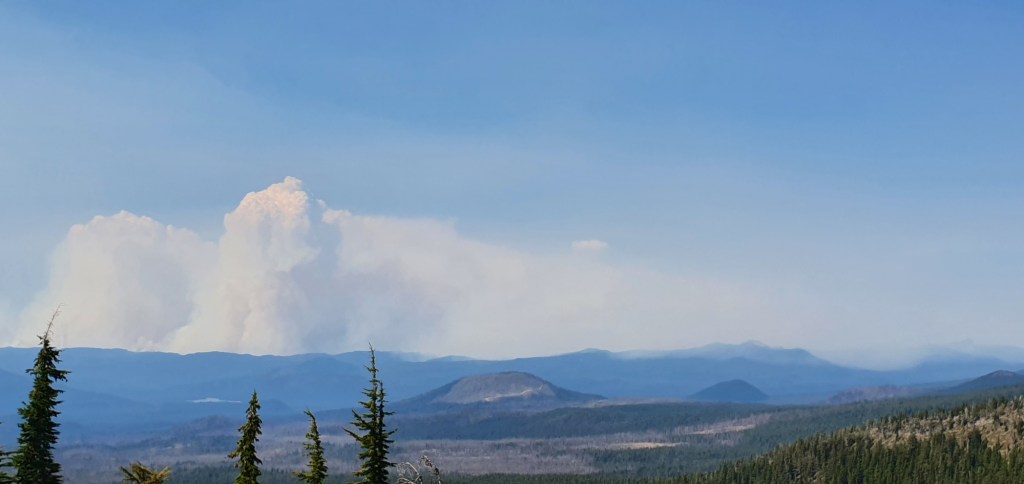 The trail wound around 4 main ridges on Mt Thielsen as it climbed. On the way around, I got to see the Emigrant Fire’s plume from closer up, and we were now too close to see the cloudtops behind the haze. The fire had grown more in the last day, and it seemed a PCT closure might be imminent. The plan to take the eastern alternate was still safe though.