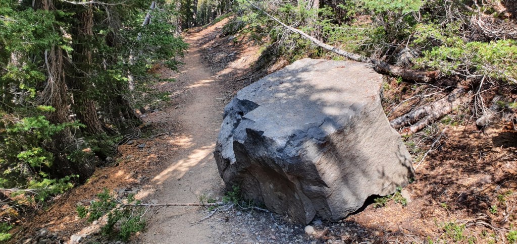 I walked along some of the flattest and softest trail I’ve ever seen today. In the morning, I walked to highway 138 and had lunch at a huge water cache. In the afternoon, we climbed up and around Mt Thielsen to camp at Theilsen Creek Meadows, a total distance of 16 miles, 25.7 km.