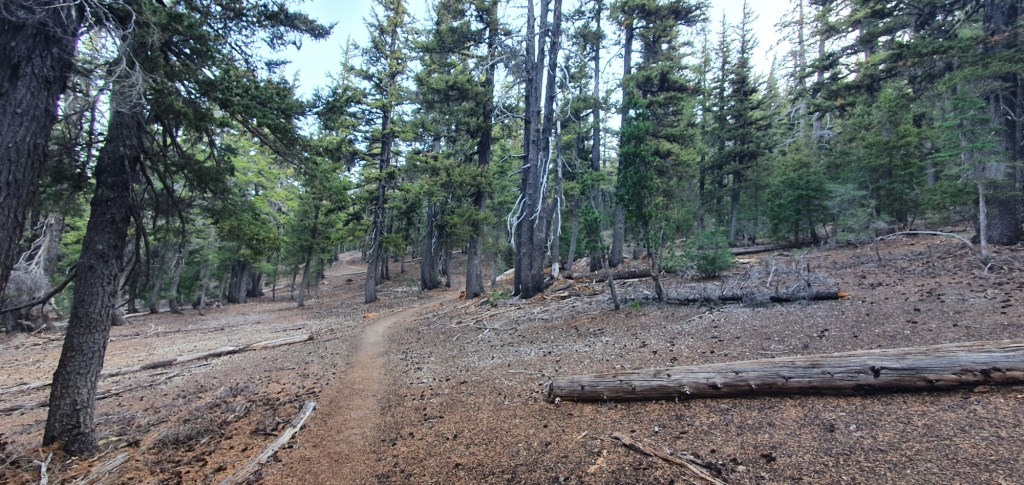 A couple of hours later, I’d climbed to the highest point in Oregon, and Washington for that matter. At 7560 ft, 2304 m, it didn’t feel as dramatic as California but just up ahead there were still good views over Oregon.