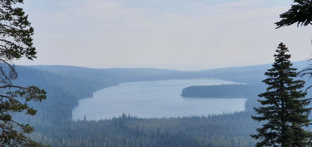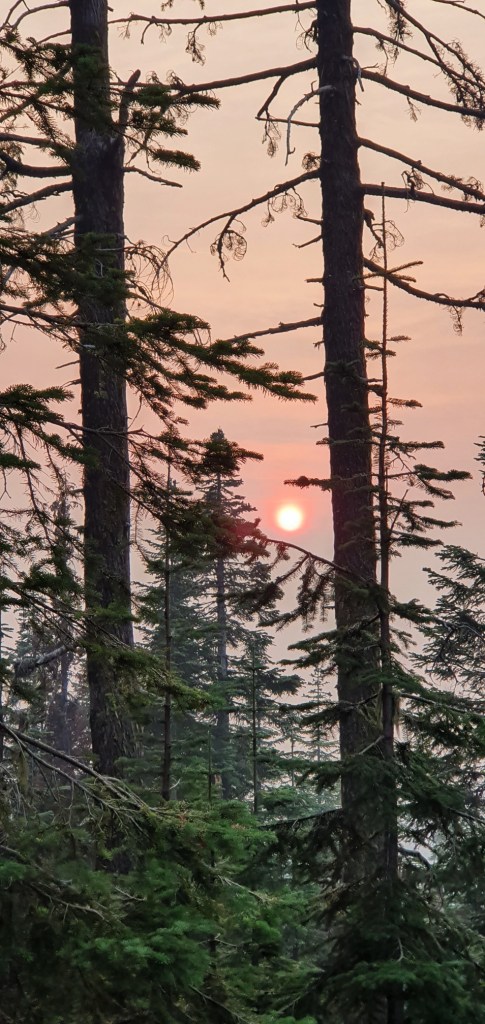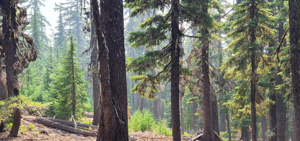 We’ve been keeping a close eye on the wildfire the last few days; the Emigrant Fire had grown to 19 500 acres since 26 August. Today we walked into the area affected by smoke from that fire. At first the smell was faint, but as we walked around the mountains and towards the fire, the smoke became thicker. I crossed the highest point on the PCT in Oregon late in the morning, and descended for most of the day after that except for a small climb up to camp. Today’s mileage was again 16 miles, 25.7 km.