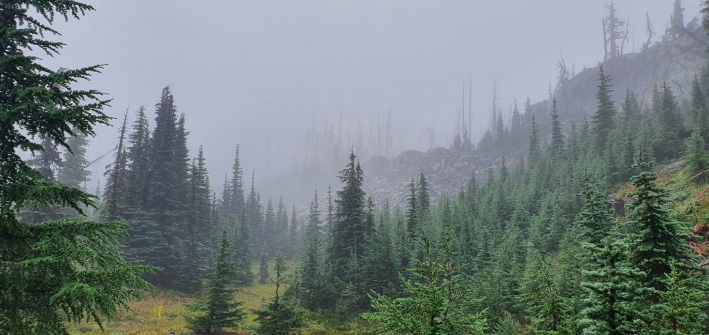 When I woke up this morning, it hadn’t started raining yet. I was luckily able to eat breakfast outside my tent and pack it up dry. As I was leaving camp, the drizzle began, and the forecast was for it to worsen. We walked through the forest for a while which sheltered us from the rain, but soon found ourselves out in a burn zone. After walking through the open for several hours, I was once again very glad to have an umbrella with me.