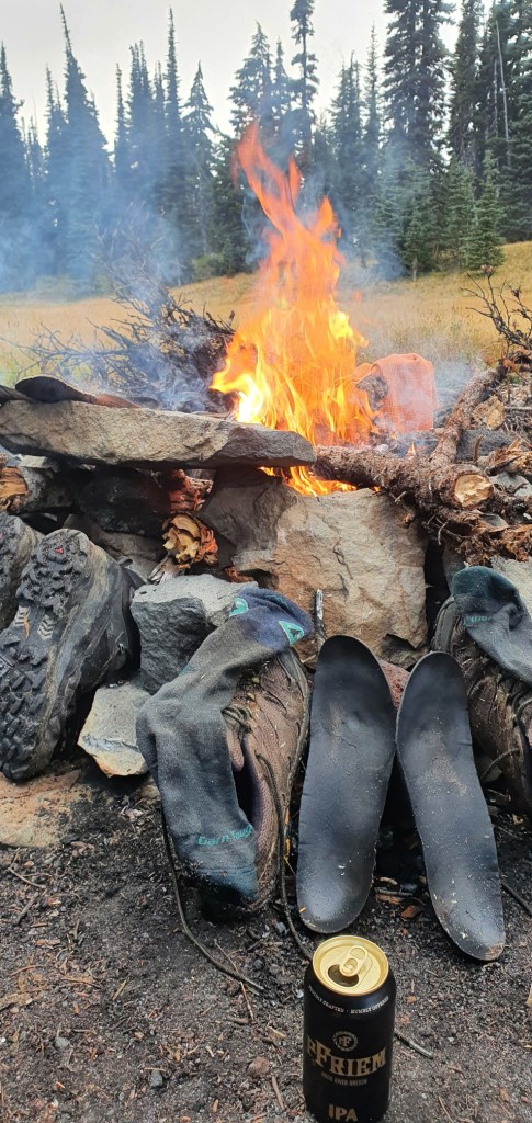It was a cold and wet day today, one of about three truly rainy days on trail. The last day like this would have been on the way up to Mike’s Place, the one before must have been Mt Laguna, both feel like lifetimes ago. The trail today took us up the Salmon River until we were near the bush line of Mt Adams. We then began circling around the western side of the mountain. All day we were in the clouds and freezing rain, when we got 9.4 miles, 15.1 km, we saw a great tentsite and called in an early day.