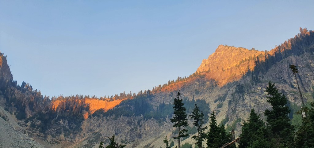 When I woke up this morning, there was smoke in the valley again. The haze made the sunrise look quite good on the mountains above, but I could smell it in the air, and it probably didn’t do me much good while I slept.