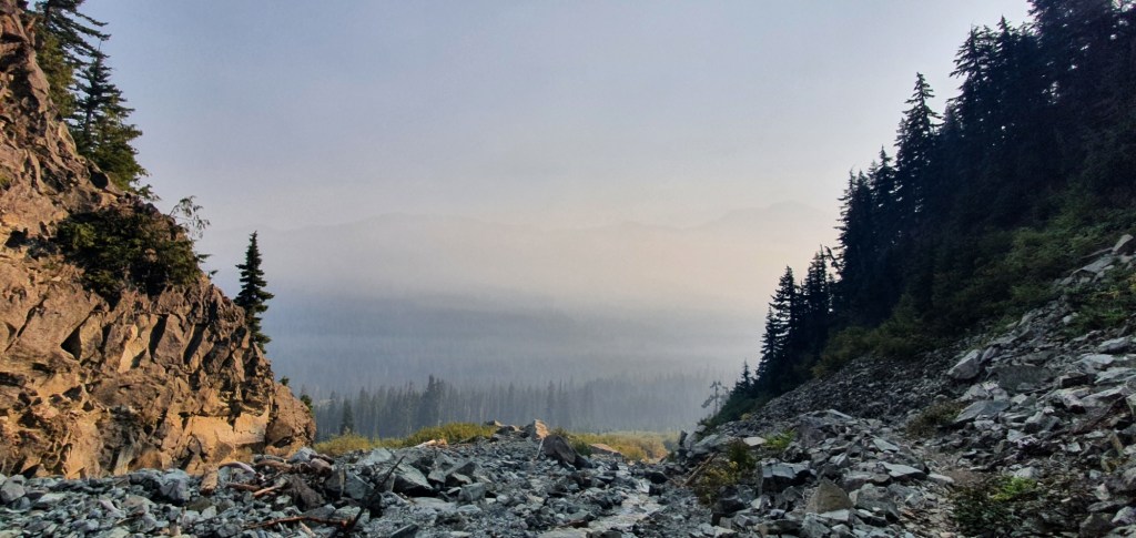As I walked around the side of Mt Daniel, I could just see through the smoke to the valley below. The mountains on the other side, visible yesterday, were now lost in haze. I crossed a stream on the way and saw layers of smoke hanging in the air.