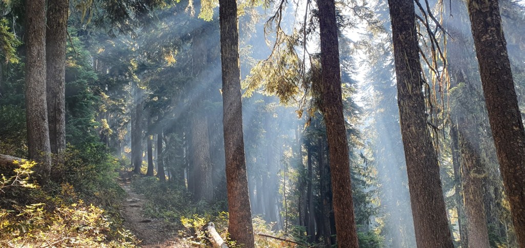 I covered my face with a damp bandana as I walked through the forest. On the climb I was breathing heavily and although a bandana isn’t ideal, it seemed to work better than nothing. The smoke was visible in the air and the sunlight looked cool coming down through the trees. Overall I felt lucky the smoke wasn’t as bad as it could have been.