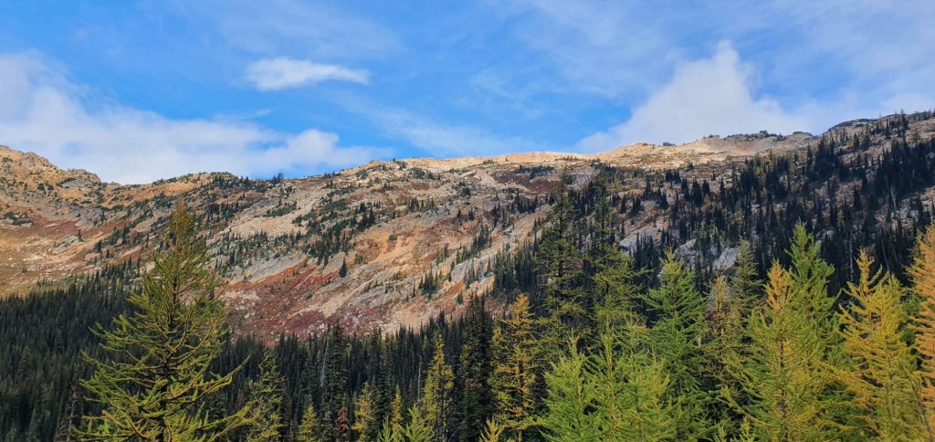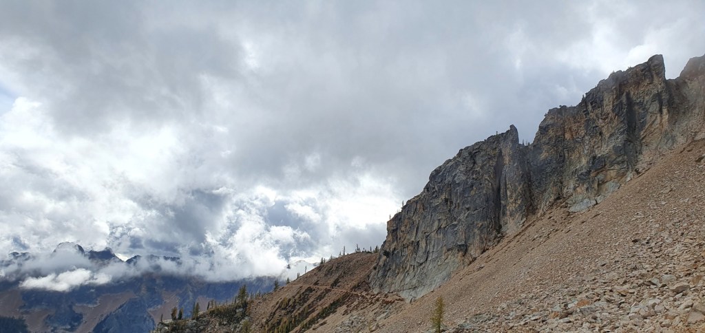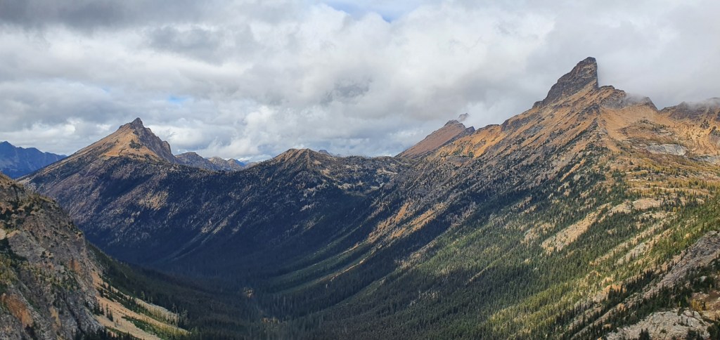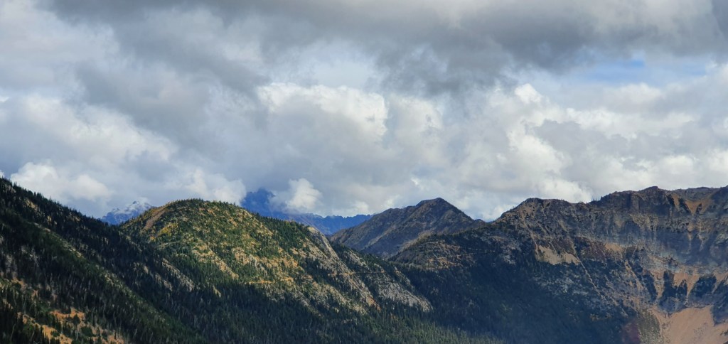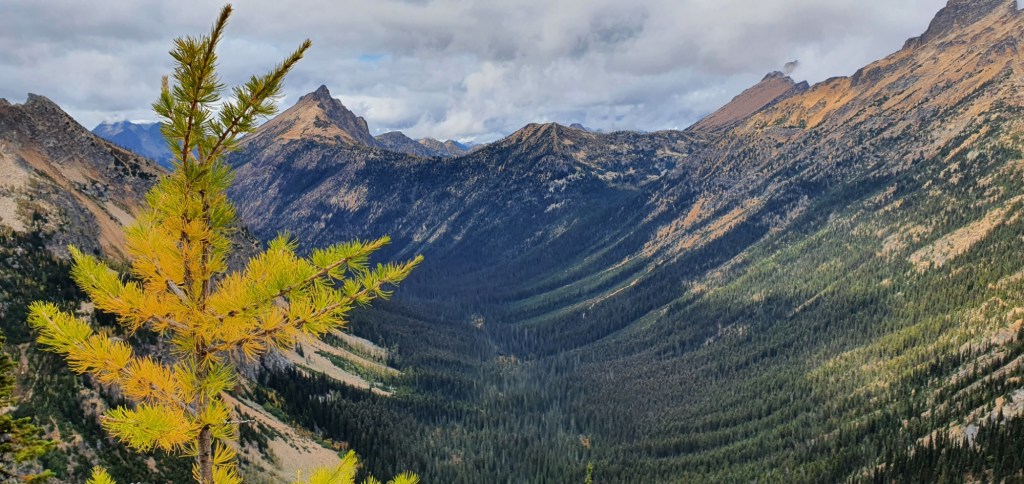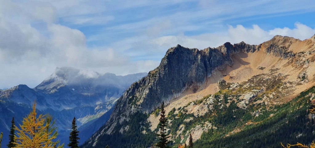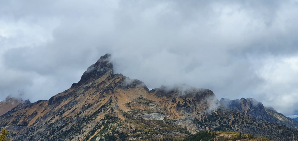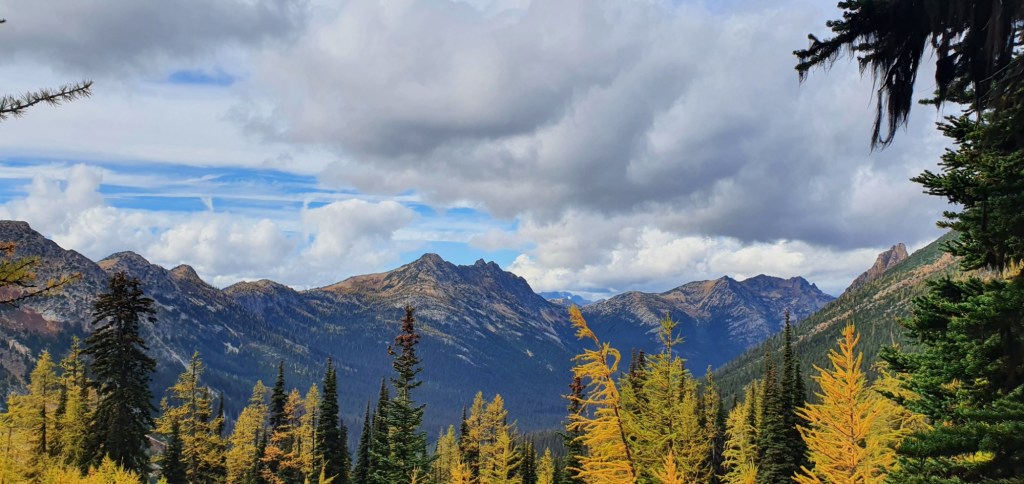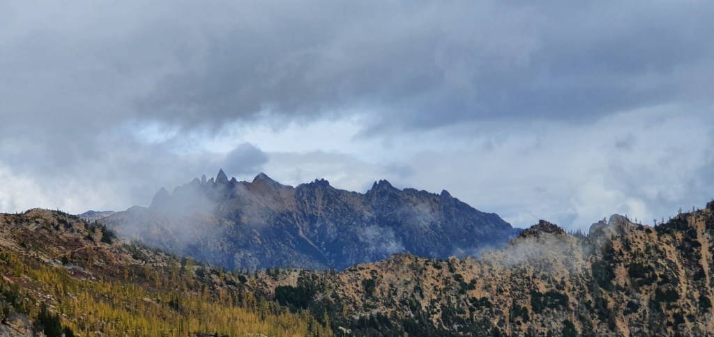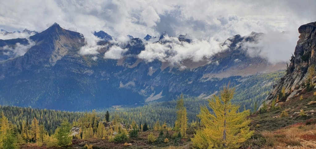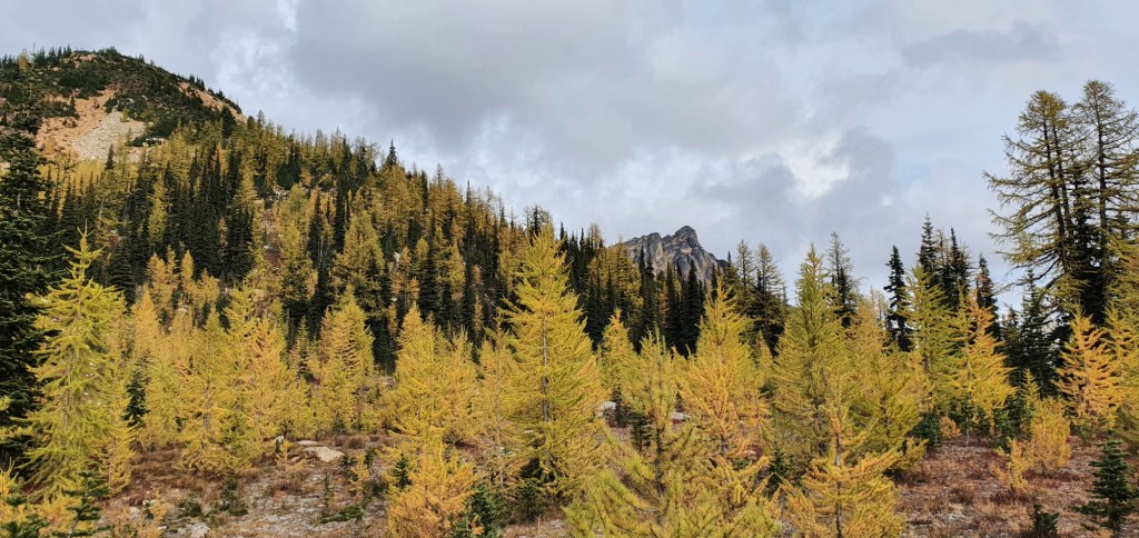 Up on Methow Pass, the larch trees were all turning a bright yellow colour for the autumn. It really has been amazing to see the seasons turning like this. All the clouds and cold weather, while challenging, highlight just how long we’ve been out here. To see the full passing of a whole hiking season in the wilderness is a true privilege and actually quite hard to digest.