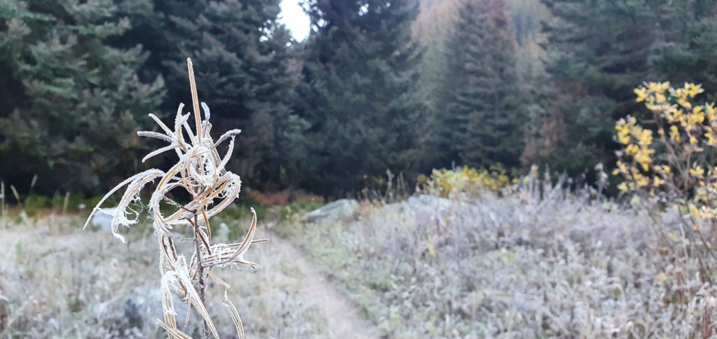 This morning, once again, everything felt as though it should have frozen, but it hadn’t. The river nearby was keeping everything damp and unfrozen. I left camp and climbed away from the river a little bit, then saw frost covering all the plants alongside the trail. It felt pretty good to be validated for feeling so cold.