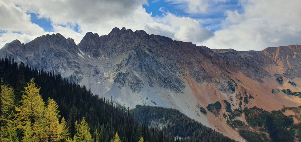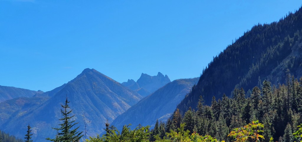 Another cold start this morning, there seems to be a trend here. All day today, except for the very end, was climbing. The trail followed the Methow River, but gradually climbed the valley wall while the river dropped away below. I turned up Bush Creek and began a brutal climb through Glacier Pass, up to Grasshopper Pass. The reward for such work was incredible views of Azurite Peak and Mt Ballard to the west, along with a panoramic vista to the east. I covered 9.7 miles today, 15.6 km.