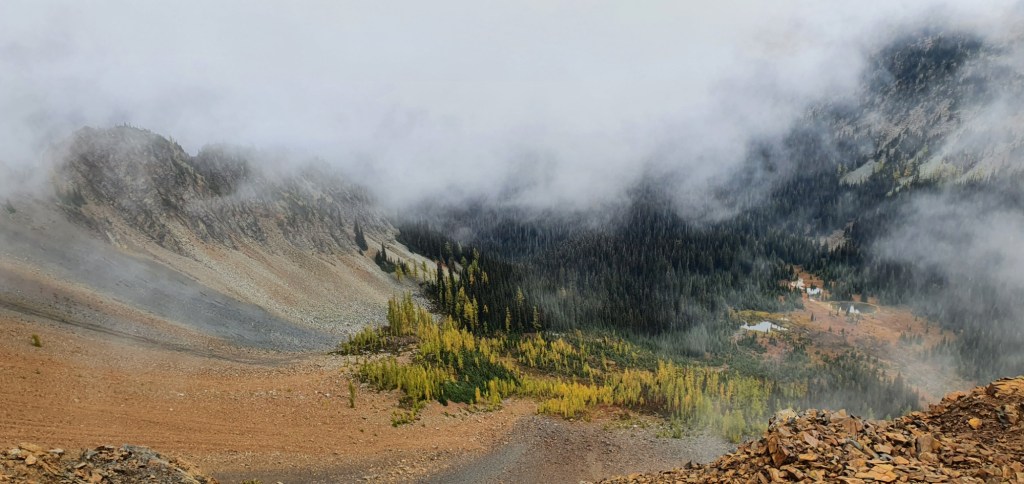 I packed up and left at 9 am, I’ve decided that at this stage of the game, there’s just no point fighting to wake up before the sun and leave just a couple of hours earlier. After I’d left, the trail wrapped around the ridges under Tatie Peak. Along the way, the clouds opened up to show me amazing scenery below.