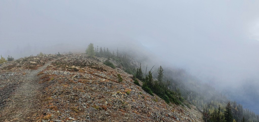 I rounded the bend and saw Harts Pass ahead, reflections off car windows parked up there caught my attention immediately. It was a short walk to the road crossing, and along the way I met dozens of day hikers who all stoked my excitement to be nearly finished. The trail took me around the back of Harts Pass Peak, and from this side of the mountain I saw a lot of cloud racing up the valley to hit Harts Pass.
