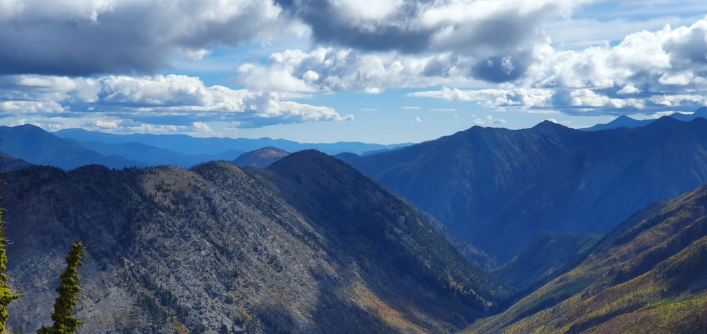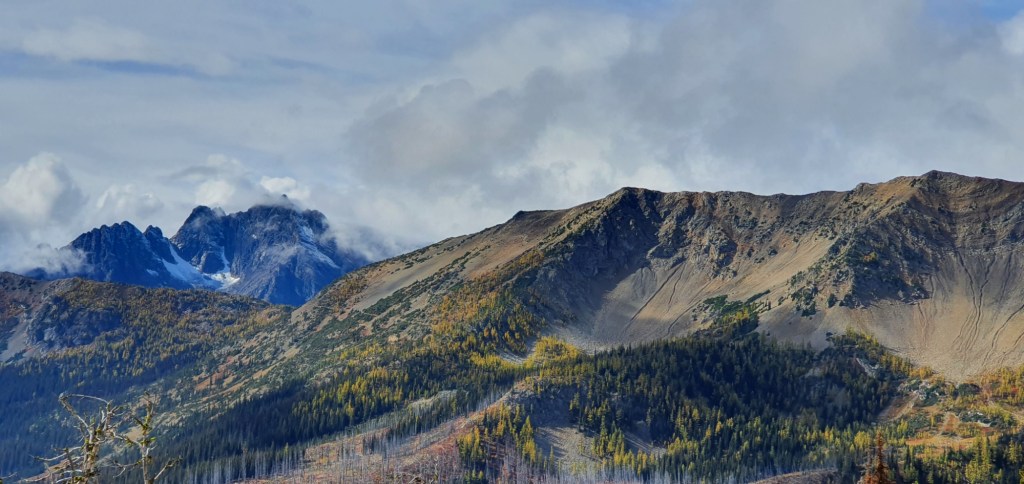 Surprisingly, this morning wasn’t as cold as the last two. I say surprising, because this morning when I woke up it was snowing. I followed the trail around the ridges of Tatie Peak, high above Trout Creek. At one point I found a rock lookout with good cellphone signal, which was the perfect place to make after tail arrangements. I then headed over a saddle and down towards Harts Pass, passing above Brown Bear Campground, Meadows Campground and around the back of Harts Pass Peak. At Harts Pass, Last Strap, a hiker who I’d camped with two nights ago, had organized with his dad to host trail magic at the pass. I spent a couple of hours here before finding camp just 10 minutes up the trail. Today was a 6 mile, 9.7 km day.