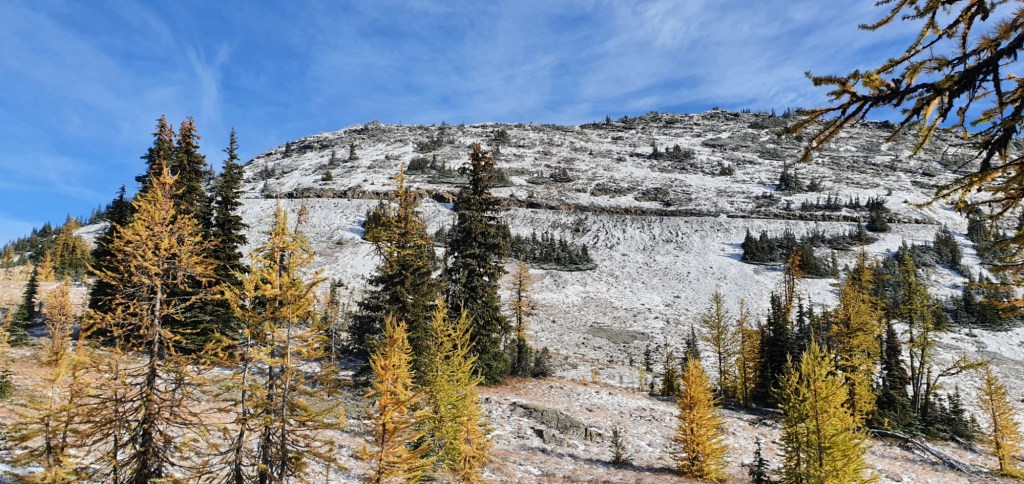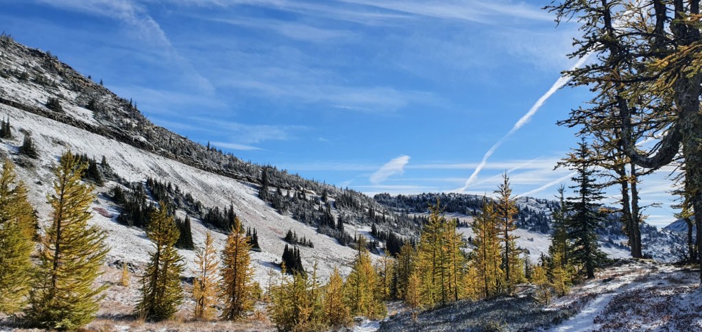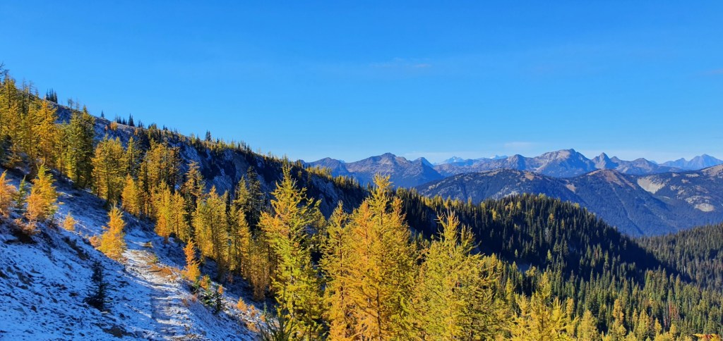 When I got on trail, the sun was out and snow was dusted over everything. I was so glad to be in the sun, but the air was still bitterly cold. I climbed up the side of the snowy ridge and took in all the views on this bluebird day. The green pines, white snow, golden larches and blue skies made this one of the most beautiful scenes I’ve ever hiked in.