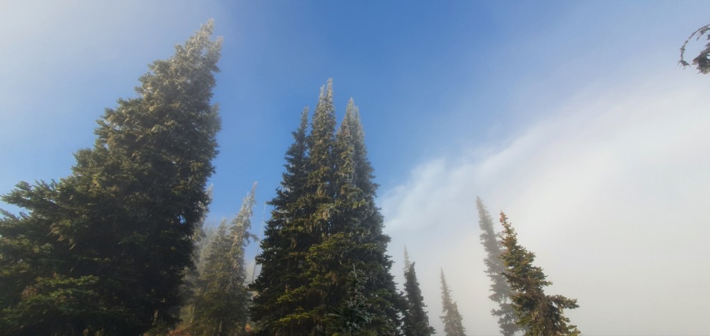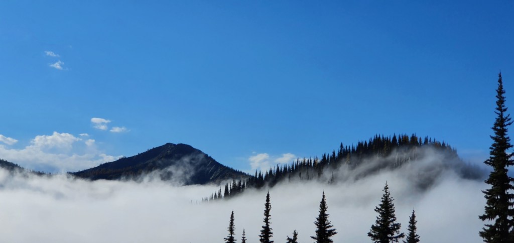 Mist continued to roll through the forest and over the passes as I headed south. The trail rose above the mist at times, revealing a beautiful landscape under bluebird skies. I walked through misty passes and over clear ridges for several hours before breaking through to ridge tops in full sunshine.